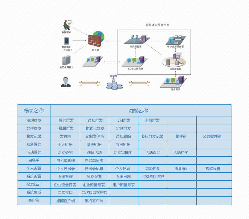 企信通云服务平台是为政府和企业提供的基于移动通信和互联网技术的信息沟通和交流平台。基于云服务的企信通平台提供更加方便、安全、稳定、顺畅的电信级短信、彩信等群发业务服务能力,支持灵活的业务策略、支持异网融合发送,是政府和企业的高效、低成本的重要沟通交流工具,企信通产品已经覆盖到全国12个省级运营商。