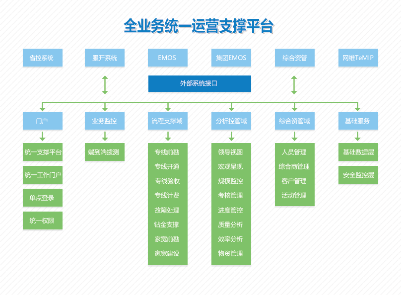全业务统一运营支撑平台,主要支撑服务内容包括:集团专线、家宽业务资源勘测、工程建设、验收管理、客户支撑管理、故障和投诉管理、运营管理、IDC建设流程管理、日志式项目管理、客户关系管理、资产管理、平台项目、数据分析与运营监控等方面的信息化技术支撑和维护升级服务。